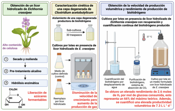 Un aspecto diferenciador de la estrategia de trabajo utilizada por la investigadora es el uso del jacinto como materia prima. El jacinto puede ser utilizado como biorremediador en cuerpos de agua dulce y, por su parte, el exceso de materia vegetal producido durante este proceso puede ser destinado a la producción de hidrógeno verde. Esto permitiría no solo el tratamiento de residuos líquidos, sino el aprovechamiento total de toda la biomasa generada, lo que va en línea con el concepto de economía circular. En palabras de la investigadora “nuestro enfoque tiene un doble beneficio ambiental tanto para la biorremediación de cuerpos lacustres como para la producción de biohidrógeno, si además consideramos el aprovechamiento industrial de los ácidos, estamos hablando de una biorrefinería donde buscamos la generación de cero residuos.