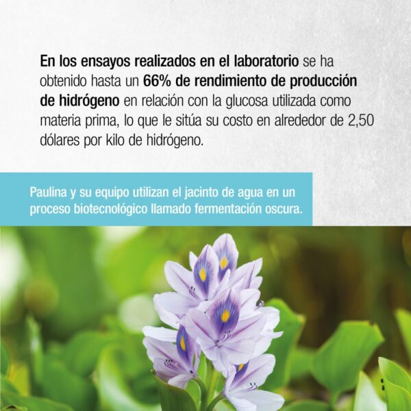 Mediante un proceso biotecnológico conocido como fermentación oscura, el equipo liderado por Paulina está utilizando el jacinto de agua como materia prima. “Es una planta que es muy utilizada en procesos de remediación, por su captura de metales pesados, pero que en la actualidad se ha convertido en una plaga. Eso, y su alto componente en celulosa, le convierte en un buen candidato para generar hidrógeno limpio”, detalla la investigadora.