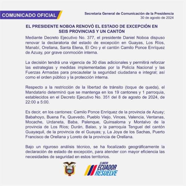 Mediante el Decreto No. 377, emitido el 30 de agosto de 2024, el presidente Daniel Noboa decidió extender el estado de excepción en seis provincias y un cantón. Las provincias de Guayas, Los Ríos, Manabí, Orellana, Santa Elena, El Oro, y el cantón Camilo Ponce Enríquez en Azuay continuarán bajo esta medida debido a una grave conmoción interna.