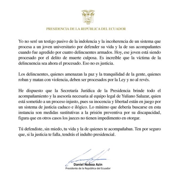 En un comunicado, el presidente de Ecuador, Daniel Noboa, expresó su indignación por el proceso judicial que enfrenta Yuliano Salazar, un joven universitario acusado de muerte culposa tras haber defendido su vida y la de sus acompañantes durante un ataque de cuatro delincuentes armados. Noboa calificó como “increíble” que una víctima de la delincuencia sea tratada como un criminal, señalando que esto no representa un acto de justicia.