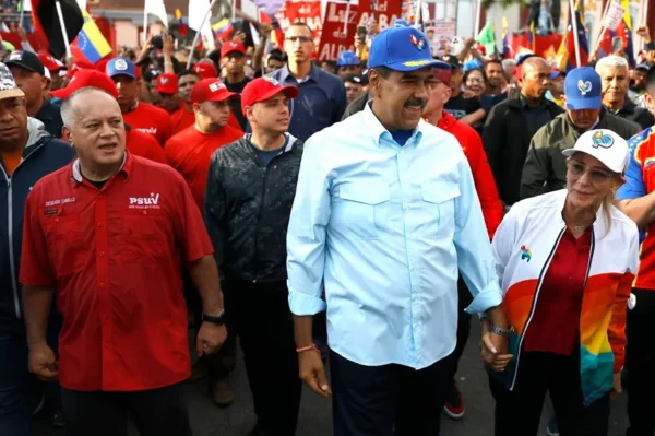El presidente de Venezuela, Nicolás Maduro (c), camina junto a su esposa, Cilia Flores, y el primer vicepresidente del oficialista Partido Socialista Unido de Venezuela (PSUV), Diosdado Cabello (i), en una imagen de archivo. EFE/Miguel Gutiérrez