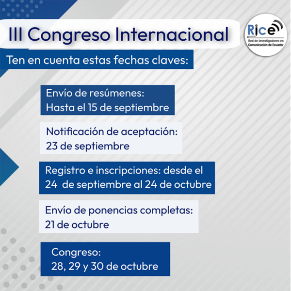 Se encuentra abierto hasta el 15 de septiembre, el período para el envío de resúmenes de ponencias para participar en el III Congreso Internacional de la Red de Investigadores en Comunicación de Ecuador (RICE). Discurso, actores, interacciones e IA en la época digital.