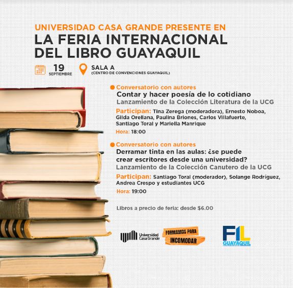 En el marco de la Feria del Libro Guayaquil, el próximo jueves 19 de septiembre se realizará la presentación de dos colecciones de libros de la Universidad Casa Grande. Invitamos a toda la comunidad casagrandina a sumarse a estos conversatorios con autores. Ambos se desarrollarán en el Salón A del Centro de Convenciones.