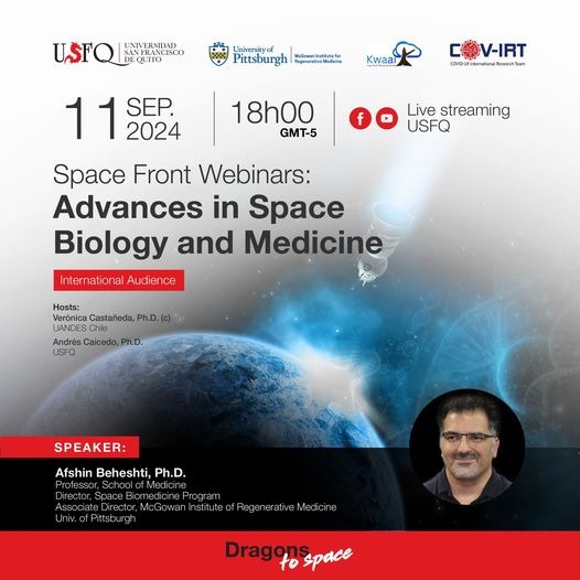 En el webinar de Space Front organizado por la USFQ, exploraremos los últimos avances en biología y medicina espacial 🧬🩺. Contaremos con la participación especial de Afshin Beheshti, director del Programa de Biomedicina Espacial en la Universidad de Pittsburgh y colaborador del NASA Working Group. Afshin compartirá su experiencia en cómo la investigación internacional está ayudando a mitigar los efectos de los viajes espaciales en la salud humana. 🌟🔬