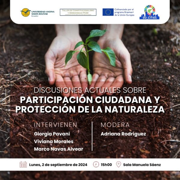 El Área de Derecho de la Universidad Andina Simón Bolívar, Sede Ecuador, el Programa Erasmus + de la Unión Europea y So’cities invitan a las “Discusiones actuales sobre participación ciudadana y protección de la naturaleza”.