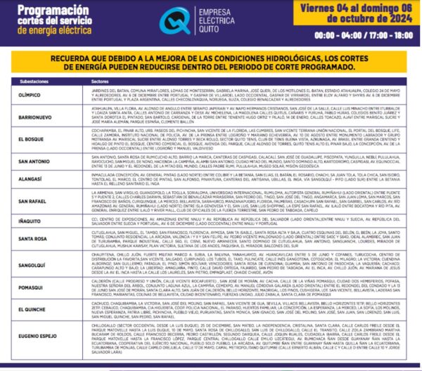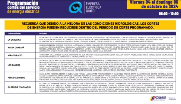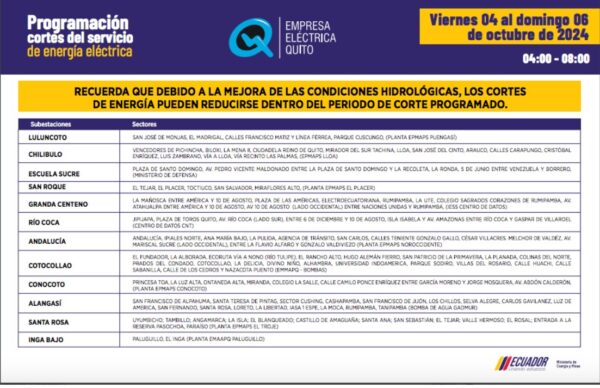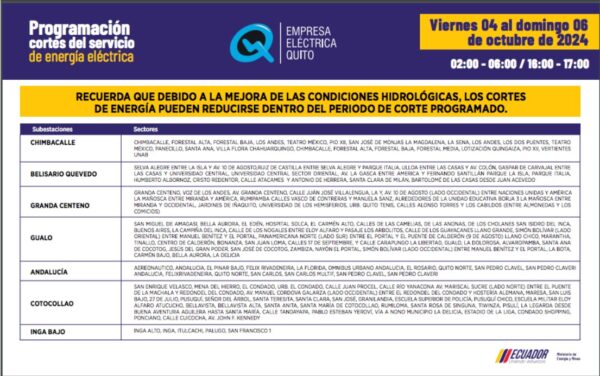 La Empresa Eléctrica Quito informó de los horarios de corte de energía en la ciudad. La noche del martes 1 de octubre el Gobierno anunció disminución de horas de cortes de luz a partir del viernes 4 de octubre al domingo 6 de octubre. (EC)