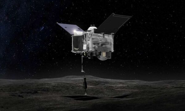 Este concepto artístico muestra la nave espacial Origins Spectral Interpretation Resource Identification Security – Regolith Explorer (OSIRIS-REx) entrando en contacto con el asteroide Bennu con el mecanismo Touch-And-Go Sample Arm Mechanism o TAGSAM.