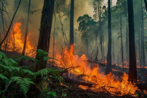 Los incendios forestales se extienden rápidamente por ecosistemas vitales, destruyendo hábitats y forzando a los animales a huir mientras la crisis climática empeora. Ilustración artística. Foto: Leonardo.ai / Christian Pérez