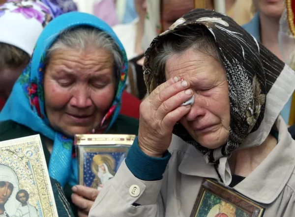 Ancianas ucranianas con iconos en sus manos lloran en Kiev. EFE