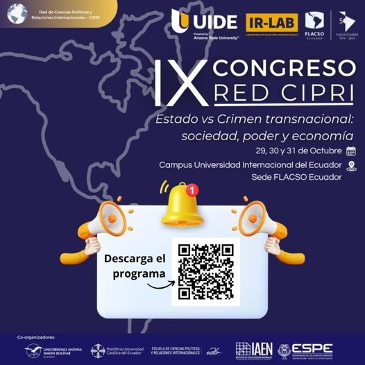 Únete al IX Congreso CIPRI que analizará la temática de “Estado vs Crimen transnacional: sociedad, poder y economía”. El evento se realizará de forma presencial del 29 al 31 de octubre de 2024 en la Universidad Internacional del Ecuador (UIDE) y FLACSO Ecuador.