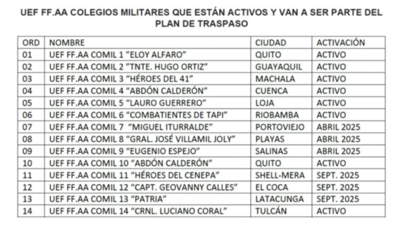 Luego de que el correísmo quitara la competencia de que las Fuerzas Armadas continúen dirigiendo colegios y escuelas, tras 14 años, 14 unidades educativas volverán a estar bajo la tutela del ejército ecuatoriano.