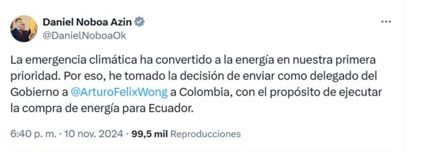 Según el Mandatario, la designación tiene como propósito ejecutar la compra de energía para Ecuador. Esto, frente a la crisis energética que atraviesa el país y los niveles mínimos históricos en los embalses de las centrales que conforman en complejo hidroeléctrico Paute.