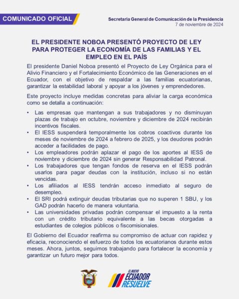 Mediante un comunicado, el presidente Daniel Noboa entregó el Proyecto de Ley Orgánica para el Alivio Financiero y el Fortalecimiento Económico de la Generaciones en el Ecuador, para garantizar estabilidad laboral en el país y lo envío a la Asamblea, hoy 8 de noviembre de 2024.