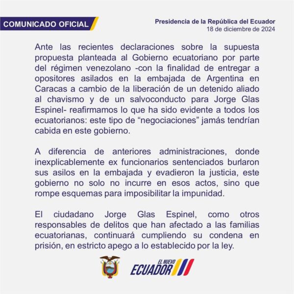 Murillo reveló que el Gobierno de Venezuela condicionó la entrega de los salvoconductos al otorgamiento de uno para el exvicepresidente ecuatoriano Jorge Glas, detenido en la cárcel La Roca. Además, indicó que se solicitó la liberación de una persona cercana al régimen venezolano, actualmente detenida en Argentina.