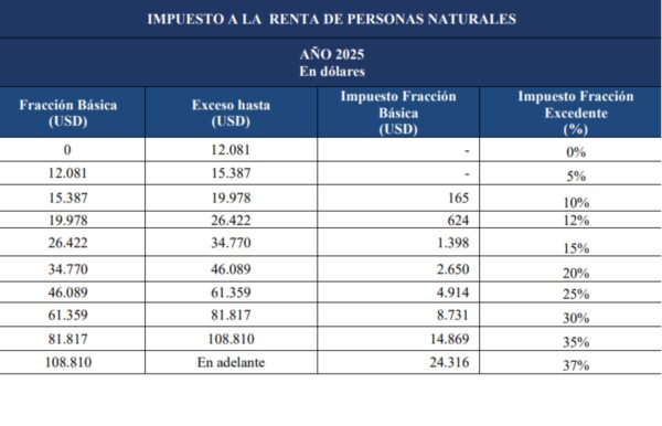 Para 2025, el pago se realiza para montos que van desde los USD 77 708, que tributarán el 5 %. En 2024, el valor para la cancelación del tributo fue de USD 76 558.