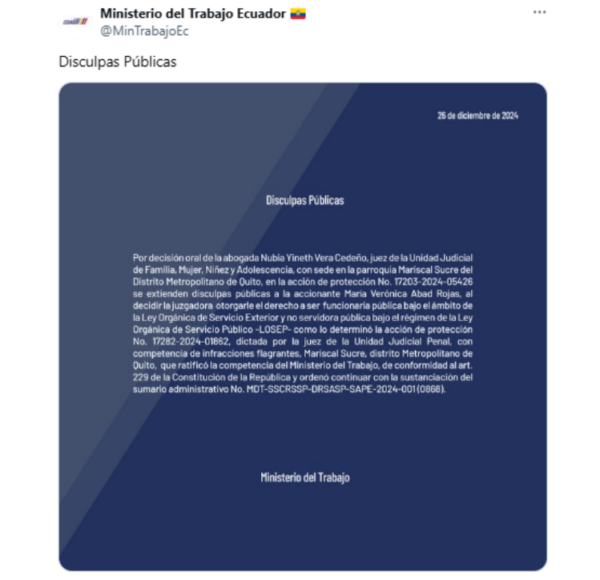 La Cartera de Estado emitió un corto comunicado en sus redes sociales. En el documento, firmado por el Ministerio de Trabajo, se señaló lo siguiente: «se extienden disculpas públicas a la accionante María Verónica Abad Rojas, al decidir la juzgadora otorgarle el derecho a ser funcionaria pública bajo el ámbito de la Ley Orgánica de Servicio Exterior y no servidora pública bajo el régimen de la Ley Orgánica de Servicio Público -LOSEP- como lo determinó la acción de protección».