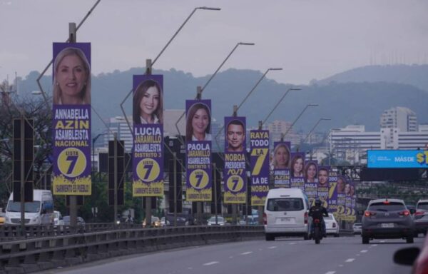 Los carteles publicitarios están en ambos lados del puente. Entre las figuras que destacan, está Annabella Azín, candidata y madre de Noboa. Así como Lucía Jaramillo.