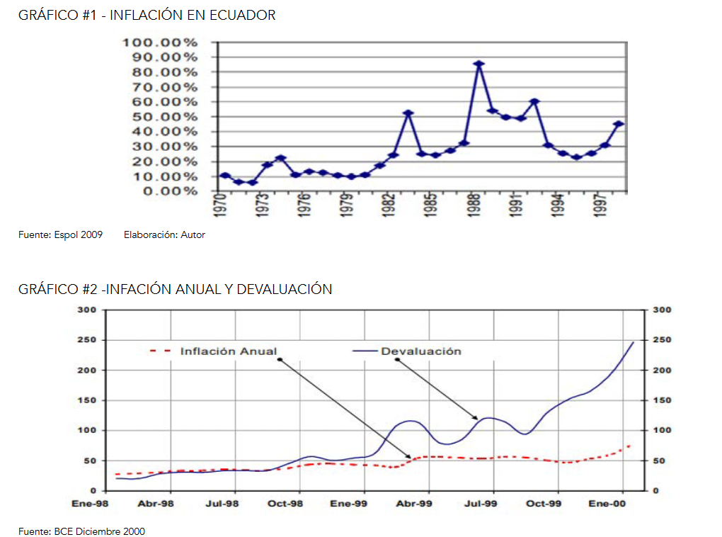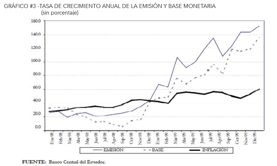 2) Entre 1998 e inicios del 2000, la devaluación ( 400%) fue muy superior a la inflación (alrededor del 100%) como muestra el gráfico #2. Este desajuste de precios relativos tenía que corregirse (con o sin dolarización) y es la razón por la cual la inflación entre 2000 y 2002 fue del 150% ya estando en dolarización. Seamos precisos: fue un reajuste localizado de precios relativos, no inflación (continua y duradera).