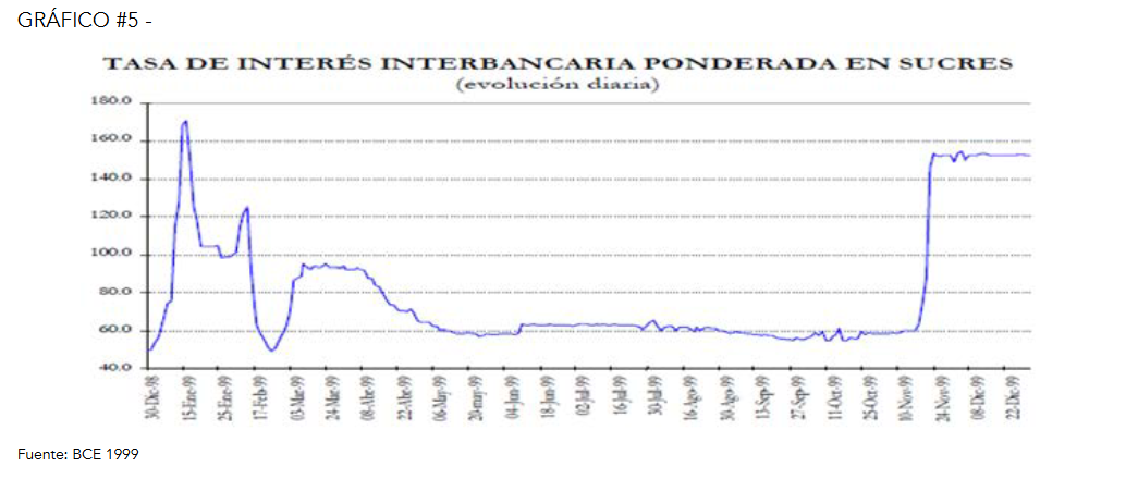 Para controlar este descalabro, una de las cosas más graves que hizo el gobierno fue el congelamiento de los depósitos en Marzo 1999. Muy grave e inútil, porque apenas se empieza a liberar lentamente el congelamiento un semestre más tarde, vuelven exactamente los mismos problemas: retiro de depósitos en los bancos y traslado de esos recursos a la compra de dólares, de ahí que el tipo de cambio vuelve a su ascenso rápido llegando a 15.000 sucres por dólar en Diciembre de 1999. El Banco Central mantiene, empecinado, la confianza de que el proceso está bajo control y su política tradicional de lucha contra la devaluación: ¡subir las tasas de interés que superan el 140% nominal anual en operaciones casi diarias! (ver gráfico #5).