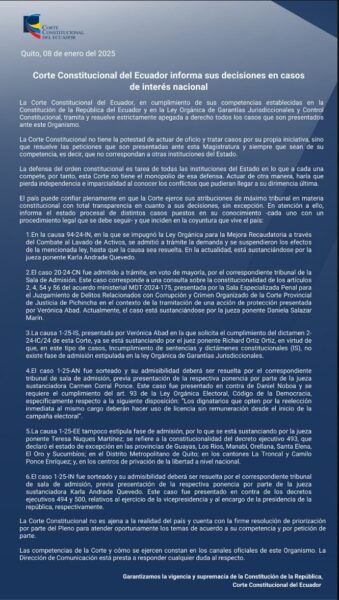 Esto se debe a que hay polémicos casos que esperan pronunciamientos del máximo tribunal del país. Especialmente, aquellos que respectan a la situación de la vicepresidenta Verónica Abad y a varias decisiones polémicas del presidente Daniel Noboa.