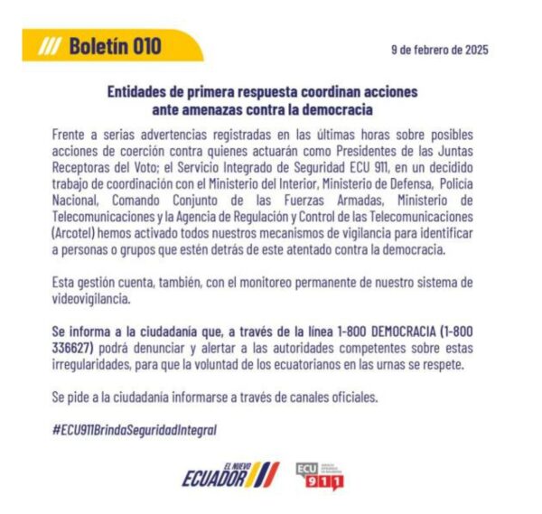 Con el inicio de las elecciones Ecuador 2025, el ECU 911 activó una línea para que los ciudadanos puedan denunciar alguna irregularidad durante el proceso. Así lo anunció la entidad en redes sociales este domingo 9 de febrero.