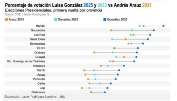 Esto se puede ver muy claramente en el gráfico elaborado por Rodríguez Sandoval y que reproduzco aquí con su autorización. En él se compara, provincia a provincia, la votación de Arauz en 2021, la de González en 2023 y la de González 2025.