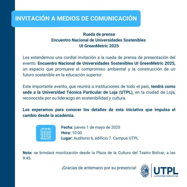 La Universidad Técnica Particular de Loja (UTPL) tiene el agrado de invitarles a la rueda de prensa del Encuentro Nacional de Universidades Sostenibles UI GreenMetric 2025.